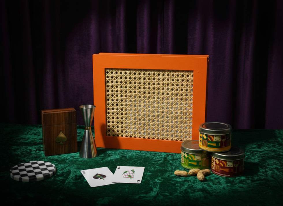 A handcrafted playing card set designed by Meir, placed inside a custom wooden box — modern, refined, and perfect for those long evenings spent with friends.