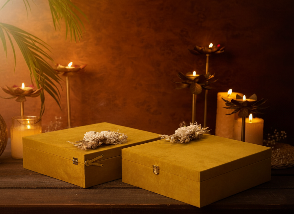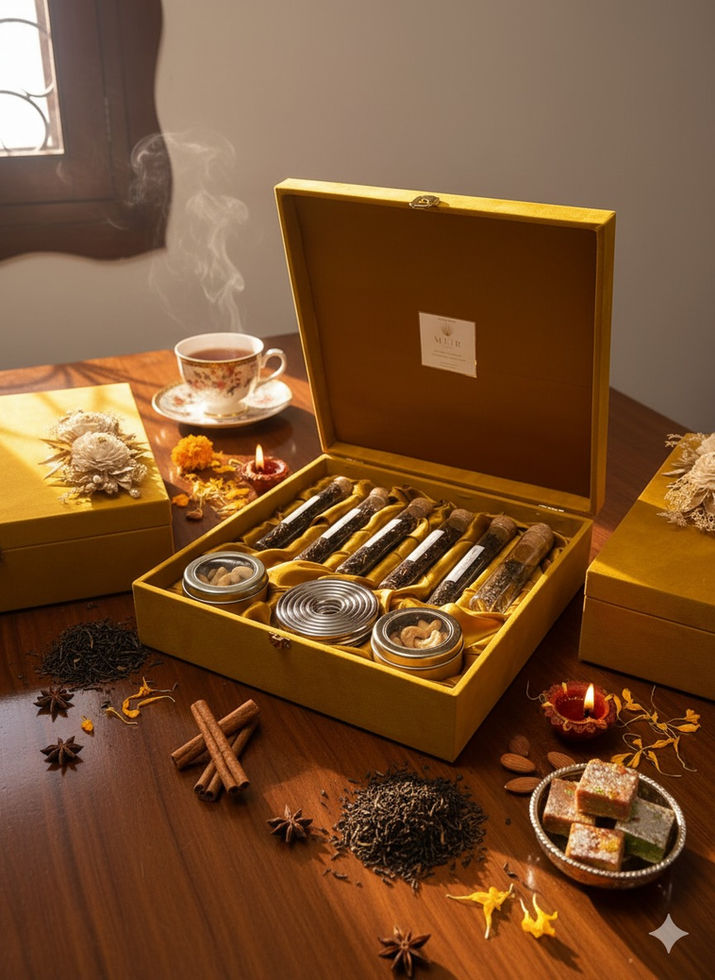 Wrapped in a vibrant mustard yellow suede hamper, this gift is an invitation to pause — to leave behind the noise of the day and steep yourself in moments that are wholly your own.